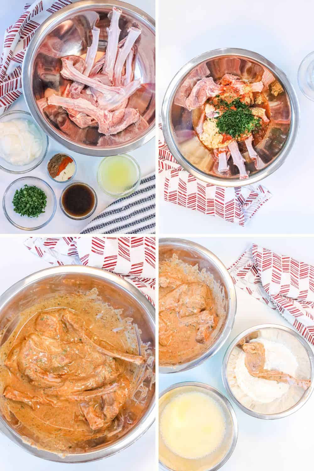 - Prepare the marinade. In a large mixing bowl, combine the honey Greek yogurt, lemon juice, kosher salt, ground ginger, paprika, onion powder, allspice, Worcestershire sauce, white wine vinegar, and chopped parsley. Mix well until smooth.Marinate the lamb chops. Add the lamb chops to the bowl and coat them thoroughly with the marinade. Cover and refrigerate for at least 30 minutes, or up to 4 hours for deeper flavor.Prepare the breading station. Place the flour in one shallow bowl.In a second bowl, whisk together the eggs and water.Place the seasoned breadcrumbs in a third bowl.Coat the lamb chops. Remove each lamb chop from the marinade.First dredge it lightly in flour, shaking off the excess.Next dip it into the egg mixture.Finally coat it evenly with breadcrumbs, pressing lightly so the coating sticks. Place it back in the fridge while the oil heats up. This will allow the breading to better stick to the lamb chops, and will result in a crispier outer shell.