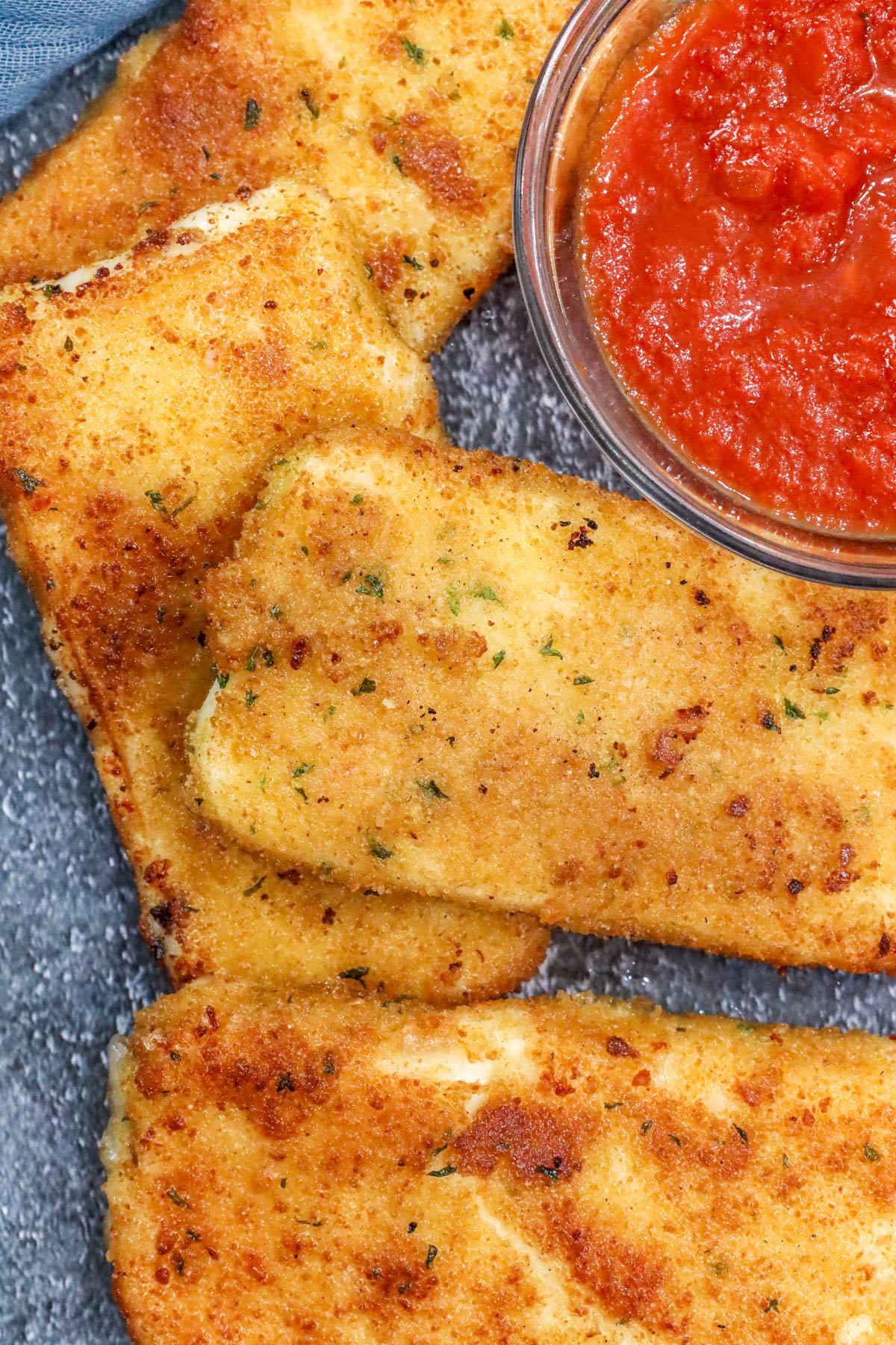 After slicing the mozzarella into even pieces, I dredge each slice in flour, dip it into the egg mixture, and coat it generously with breadcrumbs. I repeat the egg and breadcrumb step if I want extra crunch. Once breaded, I freeze the mozzarella for at least two hours — overnight is even better.