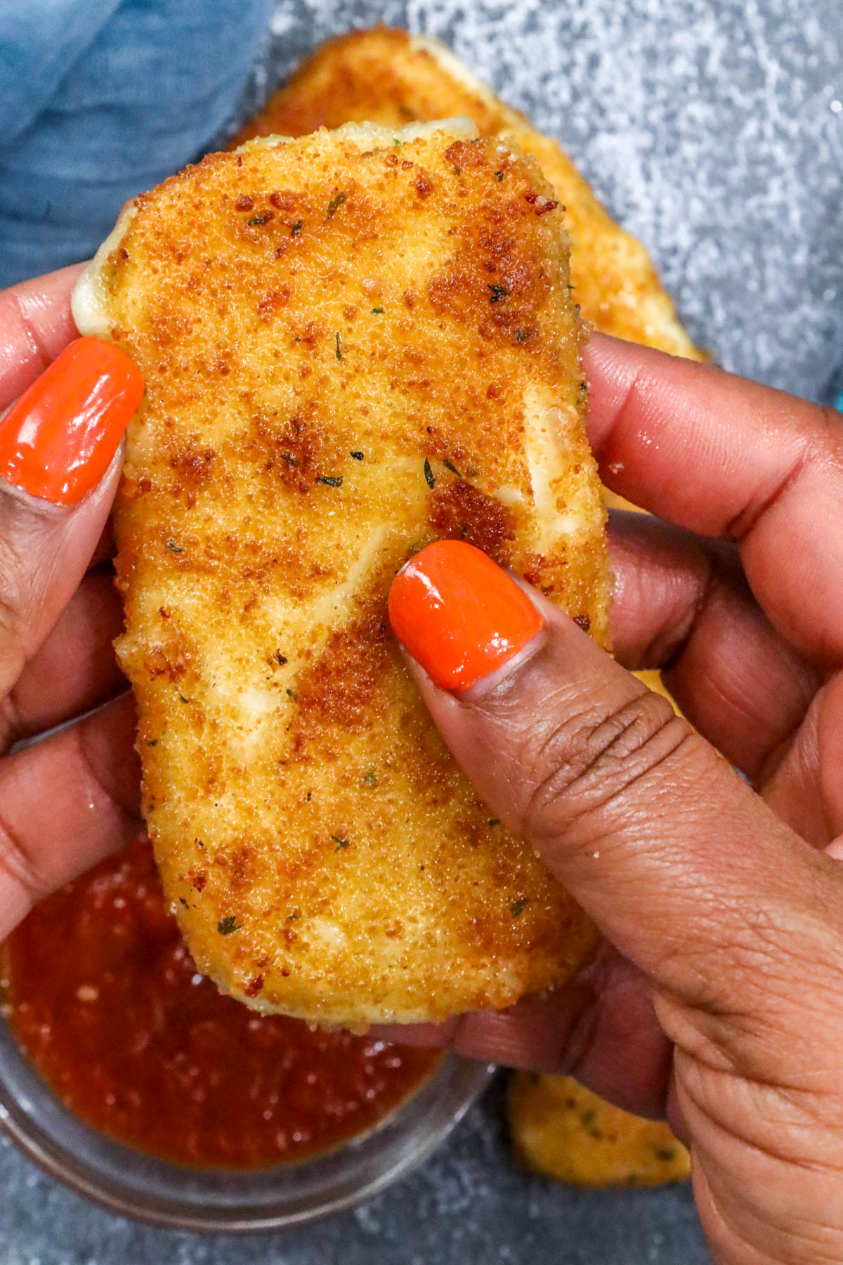 - Slice the mozzarella cheese into even pieces. Then dredge each slice in flour, dip it into the egg mixture, and coat it generously with the breadcrumbs. Repeat the egg and breadcrumb step for extra crunch. Once breaded, freeze the mozzarella for at least two hours — overnight is even better.