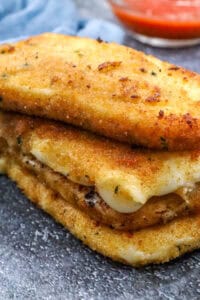 Slice the mozzarella cheese into even pieces. Then dredge each slice in flour, dip it into the egg mixture, and coat it generously with the breadcrumbs. Repeat the egg and breadcrumb step for extra crunch. Once breaded, freeze the mozzarella for at least two hours — overnight is even better.
